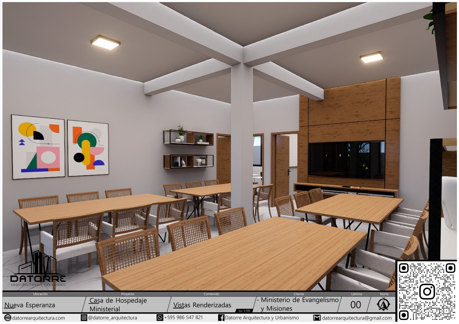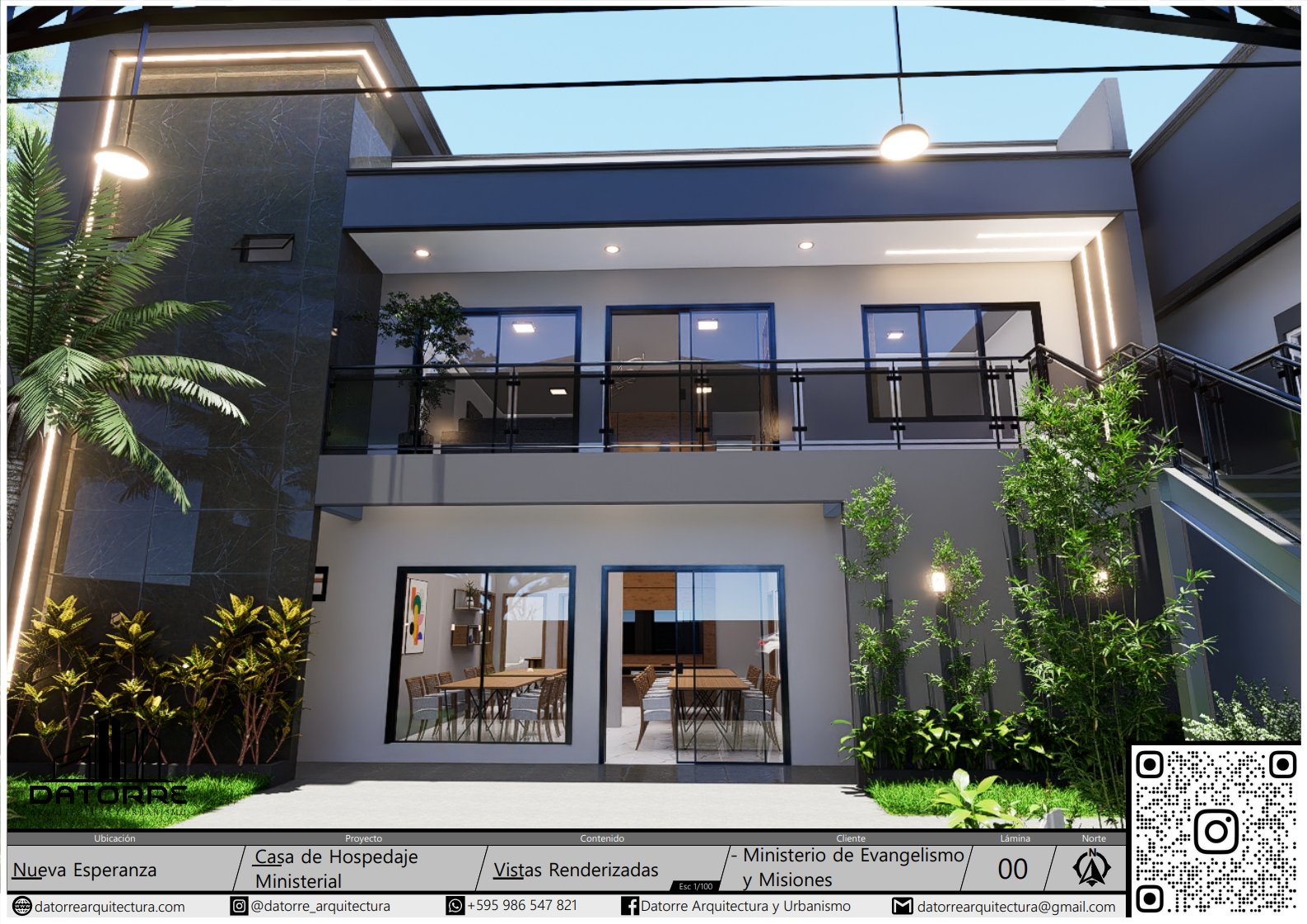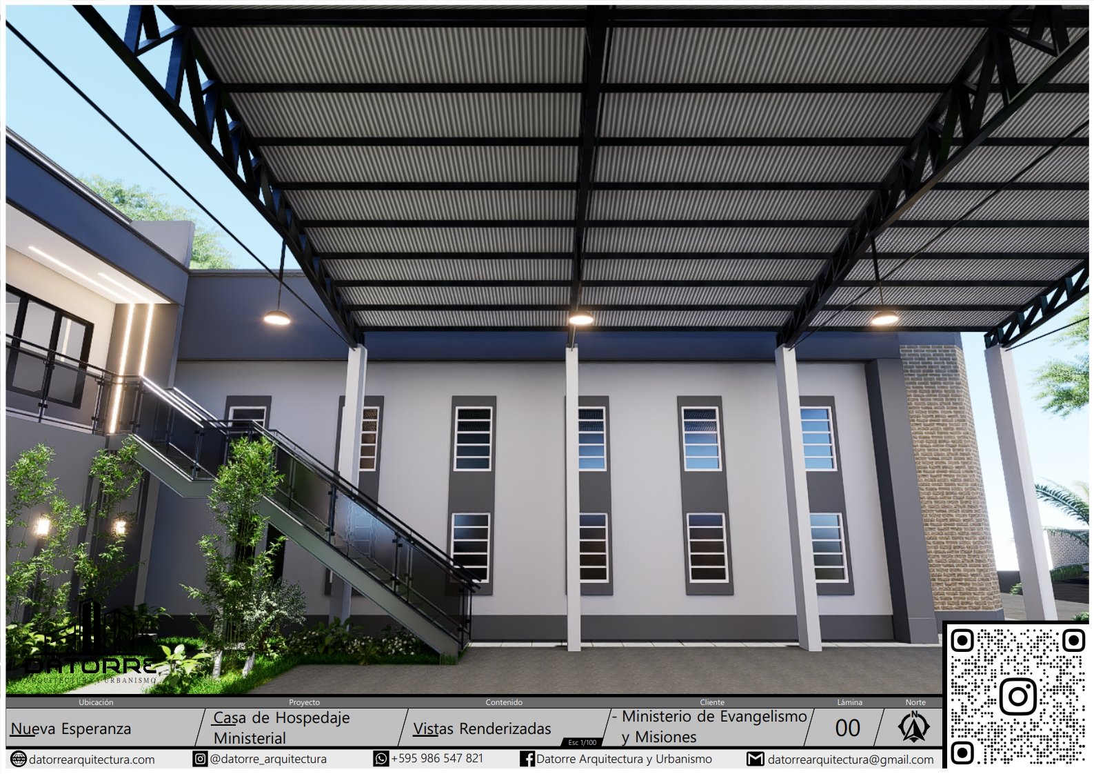 En la ciudad de Nueva Esperanza – Canindeyú, se desarrolla este proyecto para el Ministerio de Evangelismo y Misiones, concebido como un espacio de reuniones y hospedaje destinado a miembros del templo, pastores y visitantes de otras ciudades. El proyecto contempla ambientes funcionales y flexibles para encuentros, actividades comunitarias y, a futuro, espacios de apoyo para niños y jóvenes, además de un área frontal destinada a la realización de eventos y reuniones congregacionales.